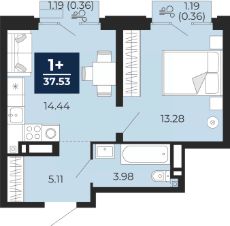 1-комн. квартира с предчистовой отделкой в ЖК "Айвазовский City" на 5 этаже. Общая площадь: 37.53 кв.м., жилая: 13.28 кв.м., площадь просторной кухни-столовой: 14.44 кв.м. Все окна выходят на одну сторону. В квартире два балкона, один совмещенный санузел. Высота потолков 2.7 м.
