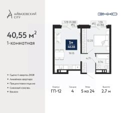Просторная однокомнатная квартира с предчистовой отделкой в ЖК "Айвазовский City" на 5 этаже. Общая площадь: 40.55 кв.м., жилая: 12.25 кв.м., площадь просторной кухни-столовой: 19.13 кв.м. Все окна выходят на одну сторону. В квартире два балкона, один совмещенный санузел. Высота потолков 2.7 м.