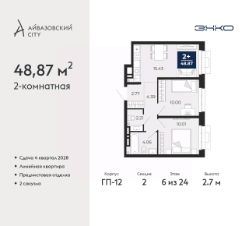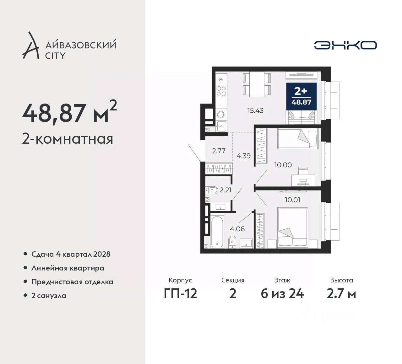 Просторная двухкомнатная квартира с предчистовой отделкой в ЖК "Айвазовский City" на 6 этаже. Общая площадь: 48.87 кв.м., жилая: 20.01 кв.м., площадь просторной кухни-столовой: 15.43 кв.м. Комнаты изолированные, все окна выходят на одну сторону. В квартире один совмещенный и один раздельный санузел. Высота потолков 2.7 м.