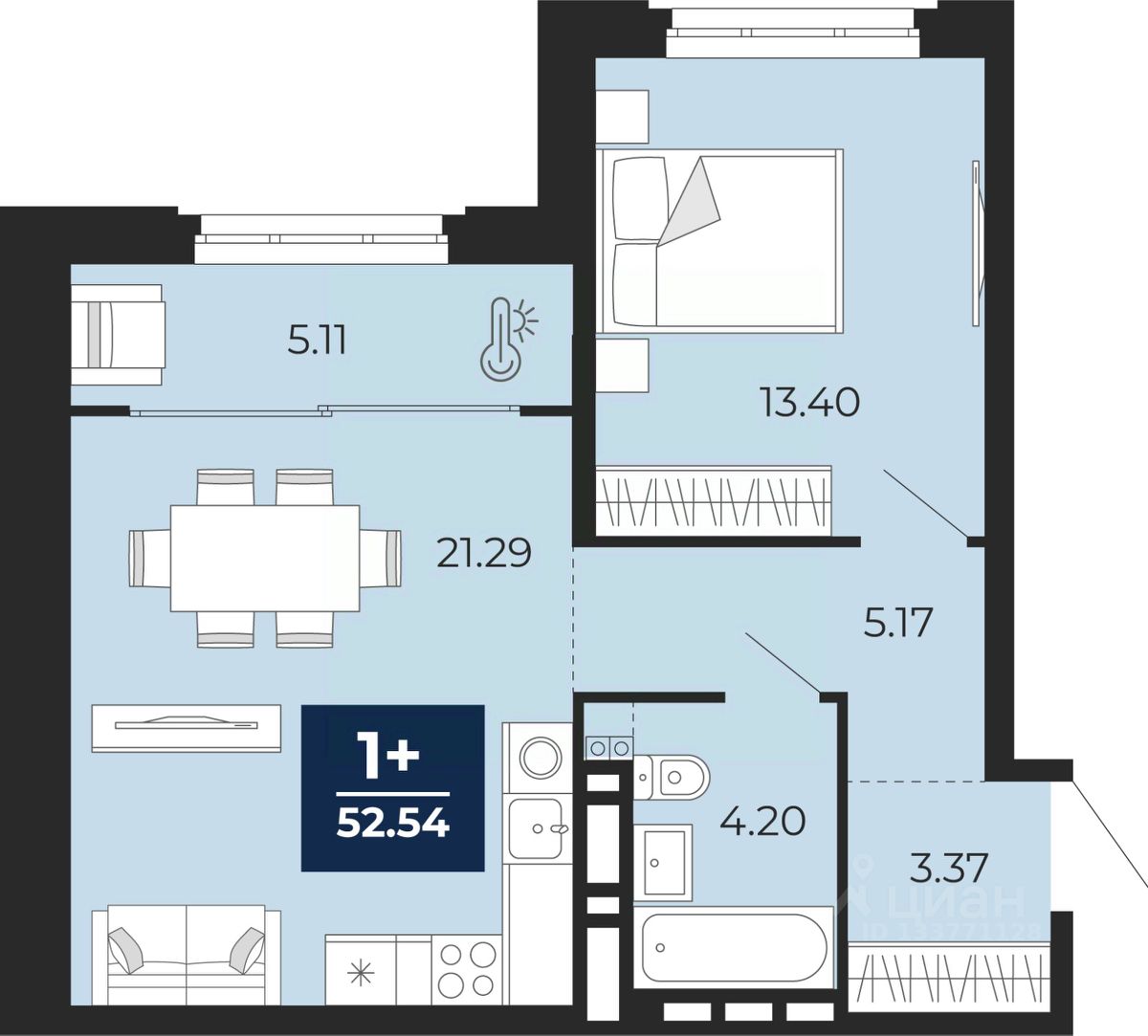 Просторная 1-комн. квартира с предчистовой отделкой в ЖК "Айвазовский City" на 2 этаже. Общая площадь: 52.54 кв.м., жилая: 13.4 кв.м., площадь просторной кухни-столовой: 21.29 кв.м. Все окна выходят на одну сторону. В квартире одна лоджия, один совмещенный санузел. Высота потолков 2.7 м.