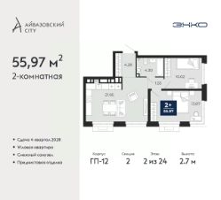 Продается двухкомнатная квартира от застройщика с предчистовой отделкой в ЖК "Айвазовский City" на 2 этаже. Общая площадь: 55.97 кв.м., жилая: 23.89 кв.м., площадь просторной кухни-столовой: 21.95 кв.м. Угловая квартира, очень светлая, естественная вентиляция при открытии окон. В квартире один совмещенный санузел. Высота потолков 2.7 м.