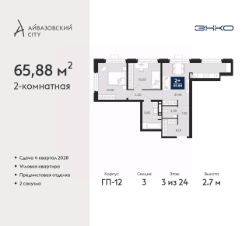 Двухкомнатная квартира с предчистовой отделкой в ЖК "Айвазовский City" на 3 этаже. Общая площадь: 65.88 кв.м., жилая: 24.19 кв.м., площадь просторной кухни-столовой: 21.46 кв.м. Квартира угловая, идеально подойдет любителям тишины и панорамных видов. В квартире один совмещенный и один раздельный санузел. Высота потолков 2.7 м.