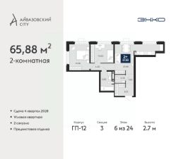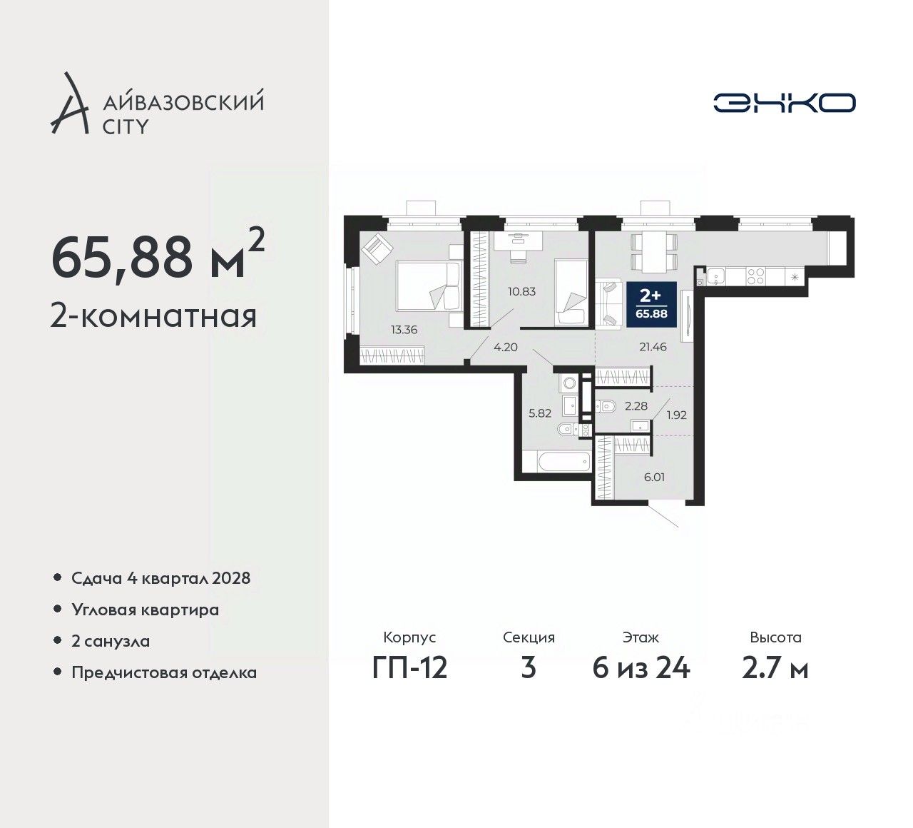Просторная двухкомнатная квартира с предчистовой отделкой в ЖК "Айвазовский City" на 6 этаже. Общая площадь: 65.88 кв.м., жилая: 24.19 кв.м., площадь просторной кухни-столовой: 21.46 кв.м. Квартира угловая, идеально подойдет любителям тишины и панорамных видов. В квартире один совмещенный и один раздельный санузел. Высота потолков 2.7 м.