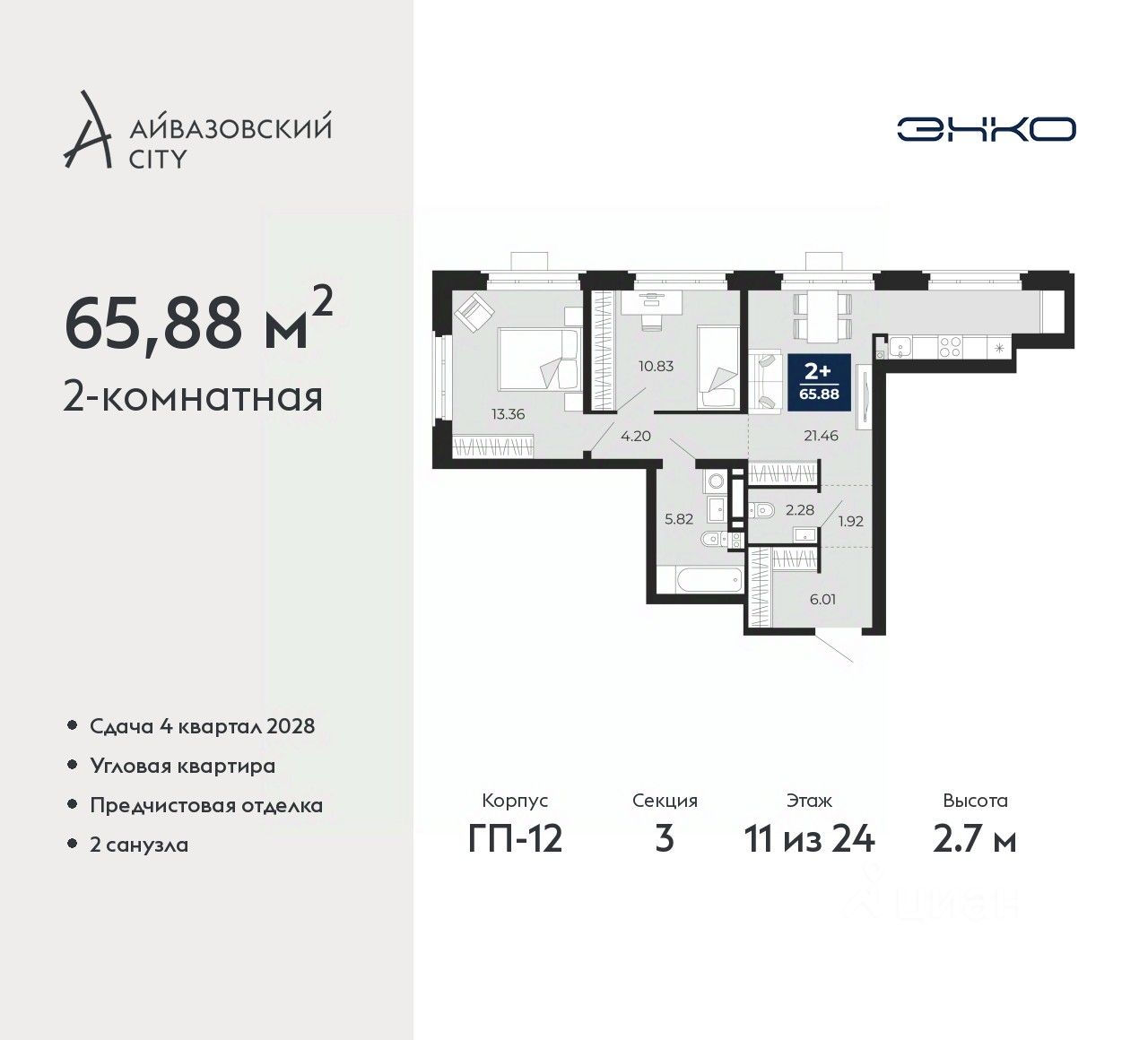 Продается 2-комн. квартира с предчистовой отделкой в ЖК "Айвазовский City" на 11 этаже. Общая площадь: 65.88 кв.м., жилая: 24.19 кв.м., площадь просторной кухни-столовой: 21.46 кв.м. Квартира угловая, идеально подойдет любителям тишины и панорамных видов. В квартире один совмещенный и один раздельный санузел. Высота потолков 2.7 м.