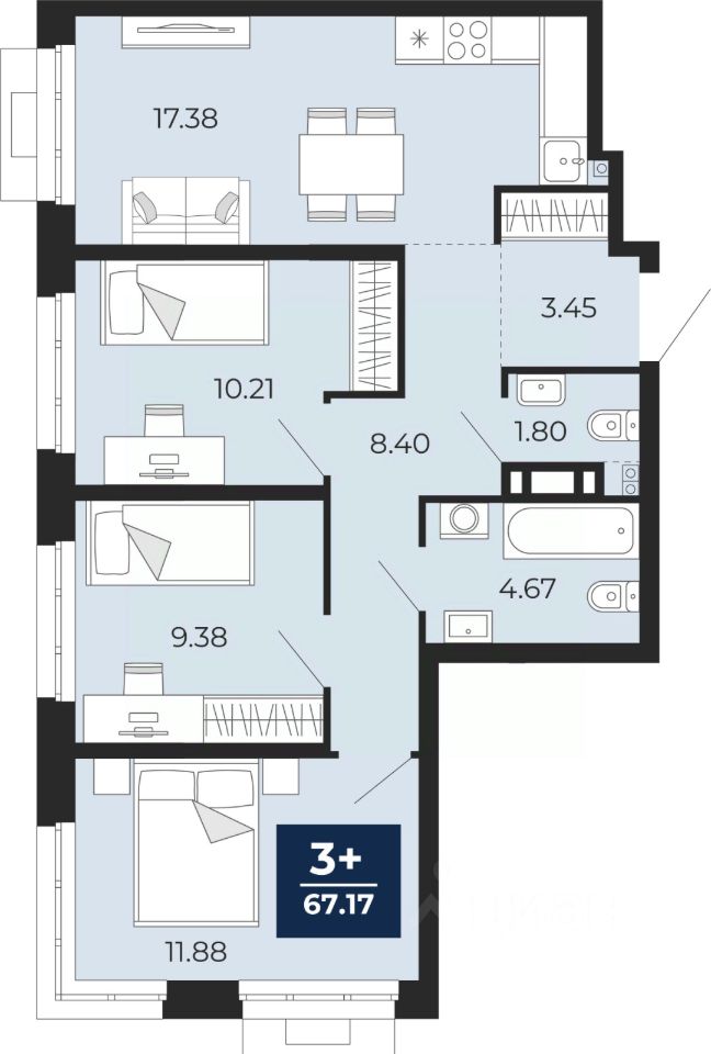3-комн. квартира от застройщика с предчистовой отделкой в ЖК "Айвазовский City" на 2 этаже. Общая площадь: 67.17 кв.м., жилая: 31.47 кв.м., площадь просторной кухни-столовой: 17.38 кв.м. Угловая квартира, очень светлая, естественная вентиляция при открытии окон. В квартире один совмещенный и один раздельный санузел. Высота потолков 2.7 м.