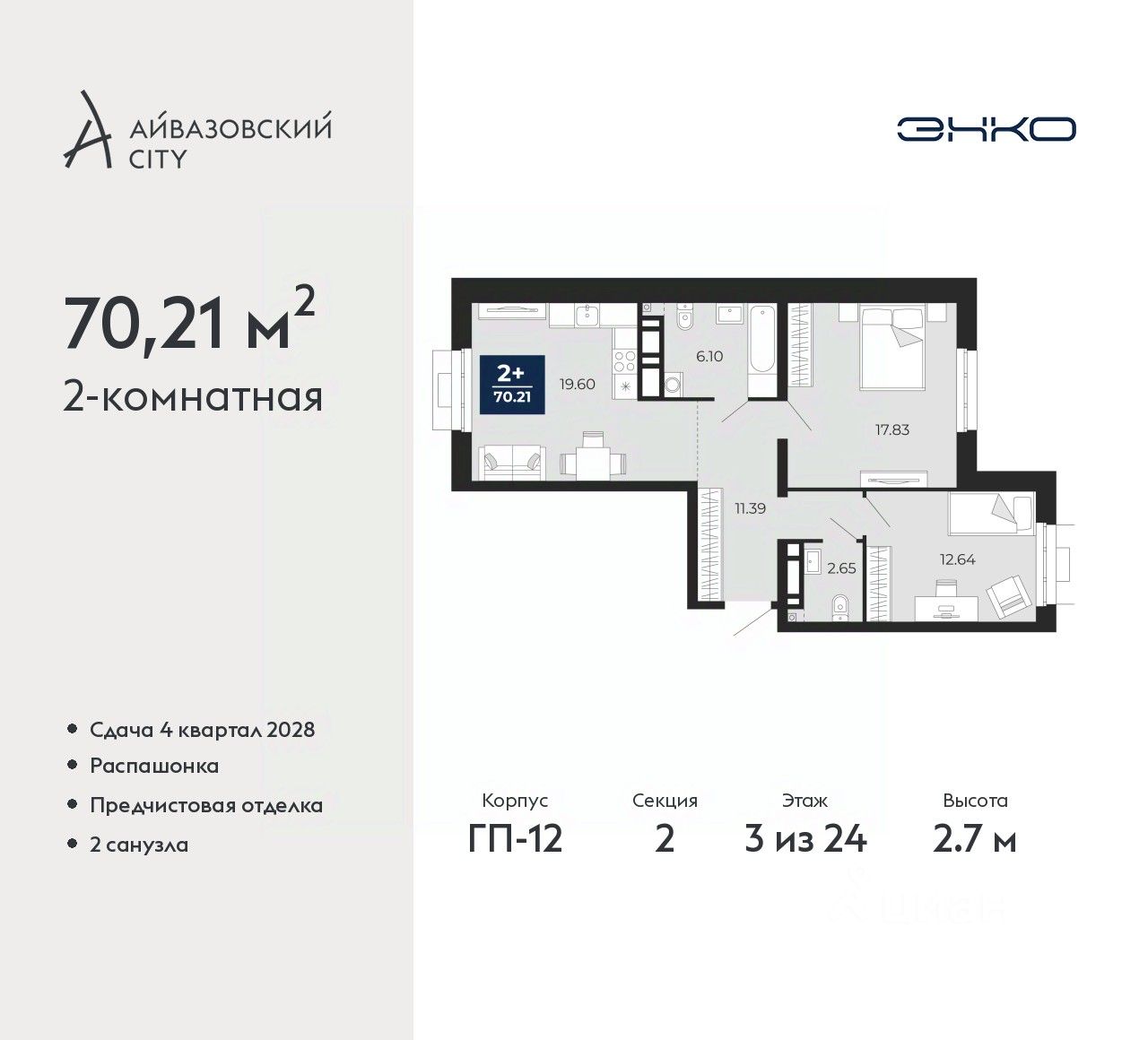 Продается 2-комн. квартира от застройщика с предчистовой отделкой в ЖК "Айвазовский City" на 3 этаже. Общая площадь: 70.21 кв.м., жилая: 30.47 кв.м., площадь просторной кухни-столовой: 19.6 кв.м. Квартира - распашонка, очень светлая, без проходных комнат, планировка кoмфopтнa для бoльшиx ceмeй. В квартире один совмещенный и один раздельный санузел. Высота потолков 2.7 м.