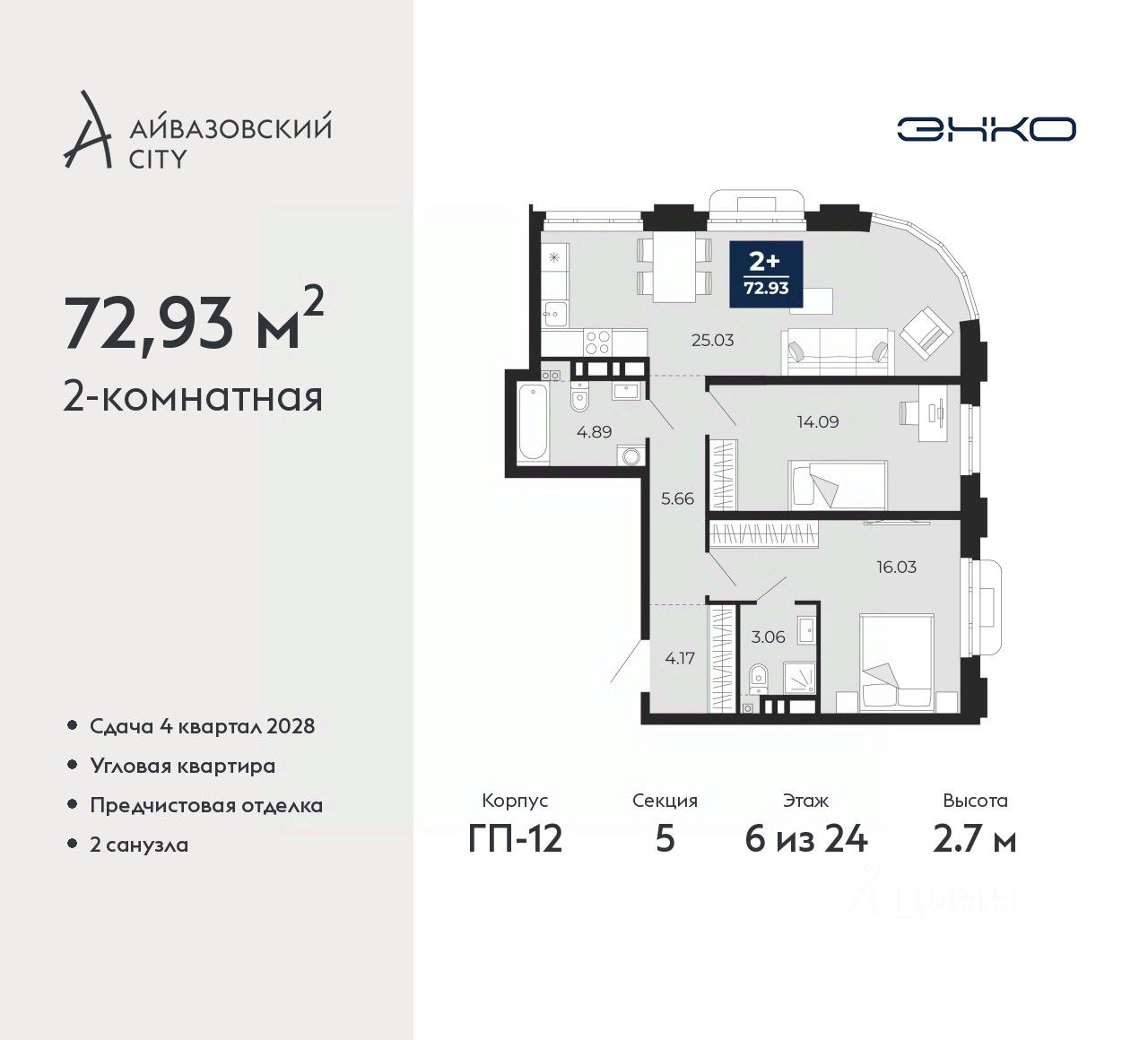 2-комн. квартира от застройщика с предчистовой отделкой в ЖК "Айвазовский City" на 6 этаже. Общая площадь: 72.93 кв.м., жилая: 30.12 кв.м., площадь просторной кухни-столовой: 25.03 кв.м. Угловая квартира, очень светлая, естественная вентиляция при открытии окон. В квартире два совмещенных санузла. Высота потолков 2.7 м.