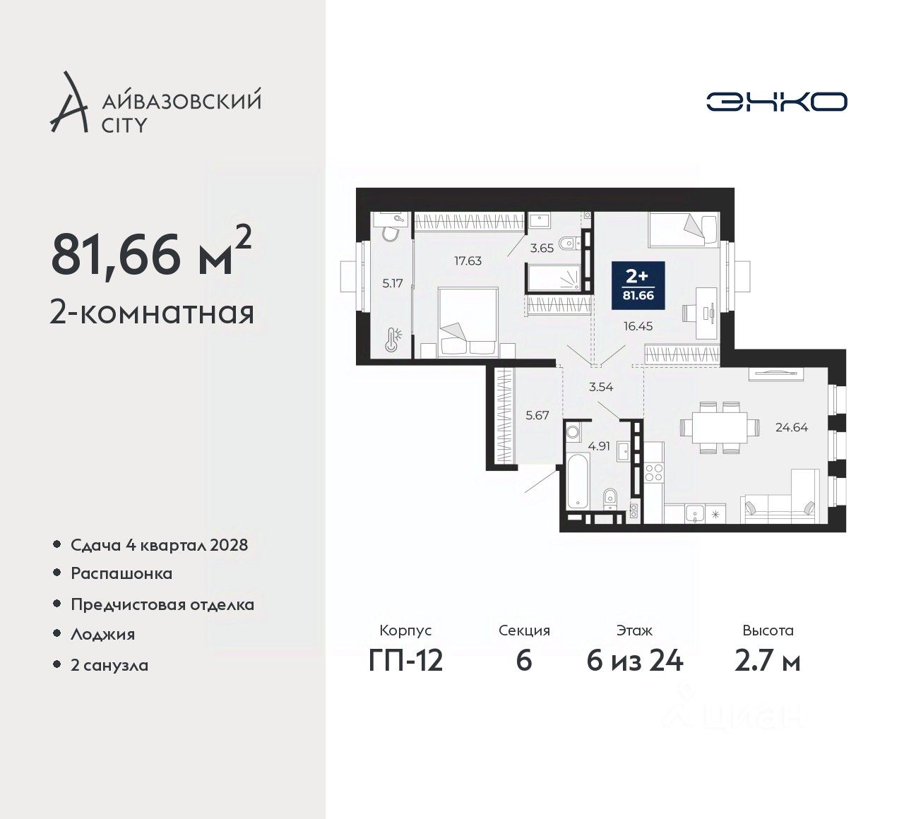Двухкомнатная квартира от застройщика с предчистовой отделкой в ЖК "Айвазовский City" на 6 этаже. Общая площадь: 81.66 кв.м., жилая: 34.08 кв.м., площадь просторной кухни-столовой: 24.64 кв.м. Квартира - распашонка, без проходных комнат, окна выходят на paзные стороны дома. В квартире одна лоджия, два совмещенных санузла. Высота потолков 2.7 м.