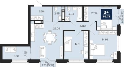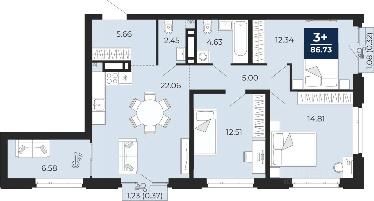 Просторная трехкомнатная квартира с предчистовой отделкой в ЖК "Айвазовский City" на 5 этаже. Общая площадь: 86.73 кв.м. Высота потолков 2.7 м.