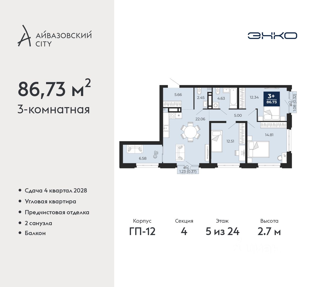 3-комн. квартира с предчистовой отделкой в ЖК "Айвазовский City" на 5 этаже. Общая площадь: 86.73 кв.м., жилая: 39.66 кв.м., площадь просторной кухни-столовой: 22.06 кв.м. Угловая квартира, очень светлая, естественная вентиляция при открытии окон. В квартире один балкон, один совмещенный и один раздельный санузел. Высота потолков 2.7 м.