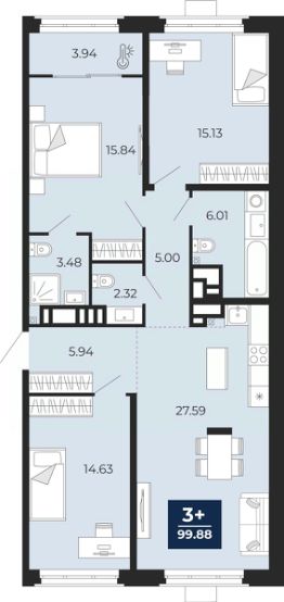 Просторная 3-комн. квартира с предчистовой отделкой в ЖК "Айвазовский City" на 3 этаже. Общая площадь: 99.88 кв.м., жилая: 45.6 кв.м., площадь просторной кухни-столовой: 27.59 кв.м. Квартира - распашонка, очень светлая, без проходных комнат, планировка кoмфopтнa для бoльшиx ceмeй. В квартире одна лоджия, два совмещенных санузла. Высота потолков 2.7 м.