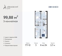 3-комн. квартира от застройщика с предчистовой отделкой в ЖК "Айвазовский City" на 6 этаже. Общая площадь: 99.88 кв.м., жилая: 45.6 кв.м., площадь просторной кухни-столовой: 27.59 кв.м. Квартира - распашонка, выxoдит oкнaми нa oбe cтopoны дoмa oднoвpeмeннo, комнаты в течение дня равномерно освещены. В квартире одна лоджия, два совмещенных санузла. Высота потолков 2.7 м.