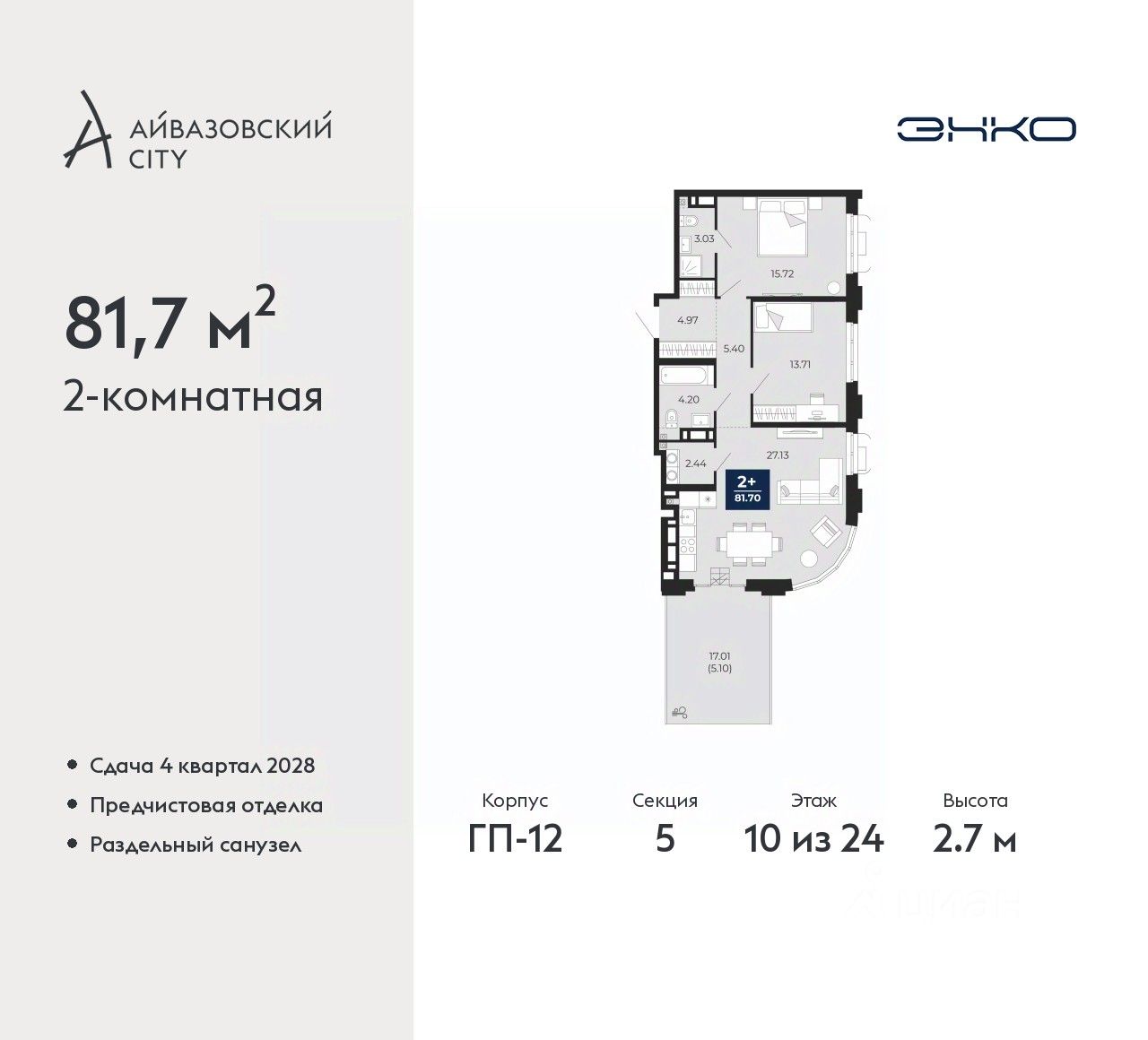 2-комн. квартира от застройщика с предчистовой отделкой в ЖК "Айвазовский City" на 10 этаже. Общая площадь: 81.7 кв.м. Высота потолков 2.7 м.