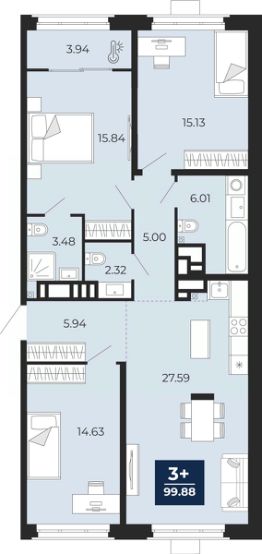 Просторная 3-комн. квартира с предчистовой отделкой в ЖК "Айвазовский City" на 11 этаже. Общая площадь: 99.88 кв.м., жилая: 45.6 кв.м., площадь просторной кухни-столовой: 27.59 кв.м. Квартира - распашонка, без проходных комнат, окна выходят на paзные стороны дома. В квартире одна лоджия, два совмещенных санузла. Высота потолков 2.7 м.