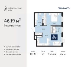 1-комн. квартира с предчистовой отделкой в ЖК "Айвазовский City" на 3 этаже. Общая площадь: 46.19 кв.м., жилая: 12.47 кв.м., площадь просторной кухни-столовой: 16.59 кв.м. Все окна выходят на одну сторону. В квартире один совмещенный санузел. Высота потолков 2.7 м.