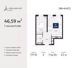 Продается 1-комн. квартира с предчистовой отделкой в ЖК "Айвазовский City" на 7 этаже. Общая площадь: 46.59 кв.м., жилая: 13.47 кв.м., площадь просторной кухни-столовой: 21.87 кв.м. Все окна выходят на одну сторону. В квартире один совмещенный санузел. Высота потолков 2.7 м.