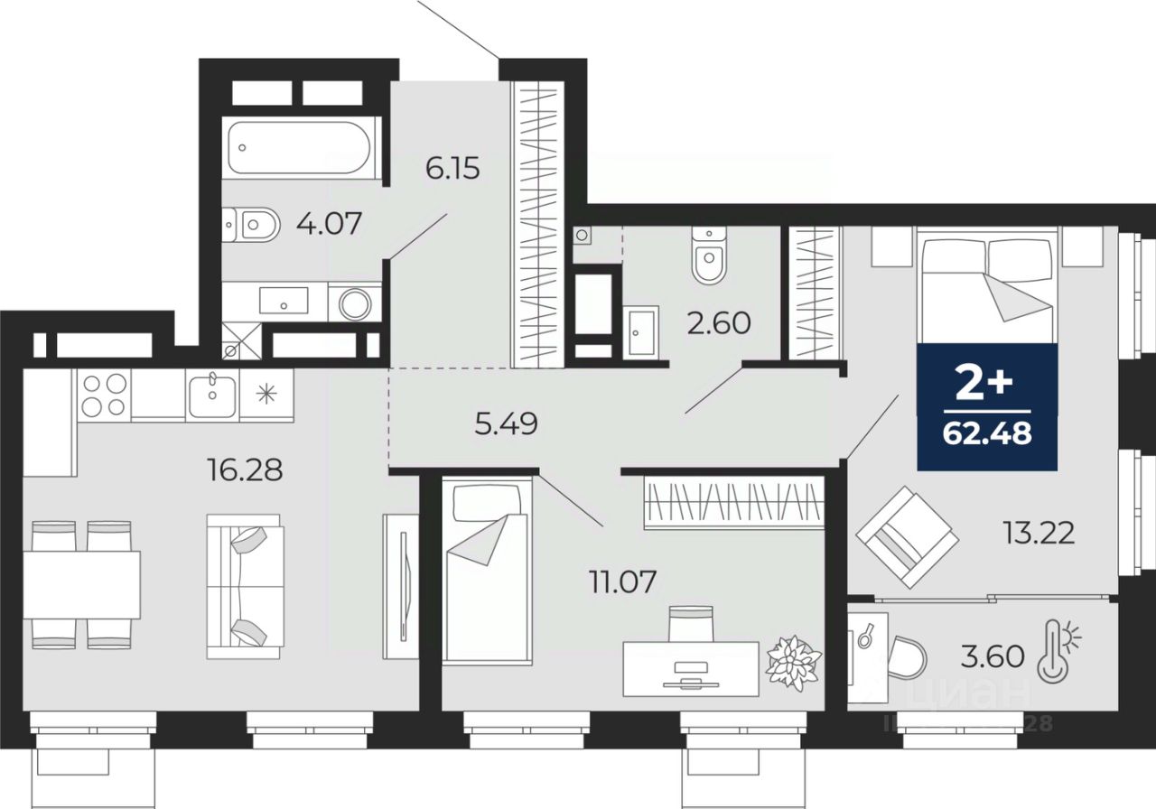 Просторная 2-комн. квартира с предчистовой отделкой в ЖК "Айвазовский City" на 4 этаже. Общая площадь: 62.48 кв.м., жилая: 24.29 кв.м., площадь просторной кухни-столовой: 16.28 кв.м. Квартира угловая, идеально подойдет любителям тишины и панорамных видов. В квартире одна лоджия, один совмещенный и один раздельный санузел. Высота потолков 2.7 м.