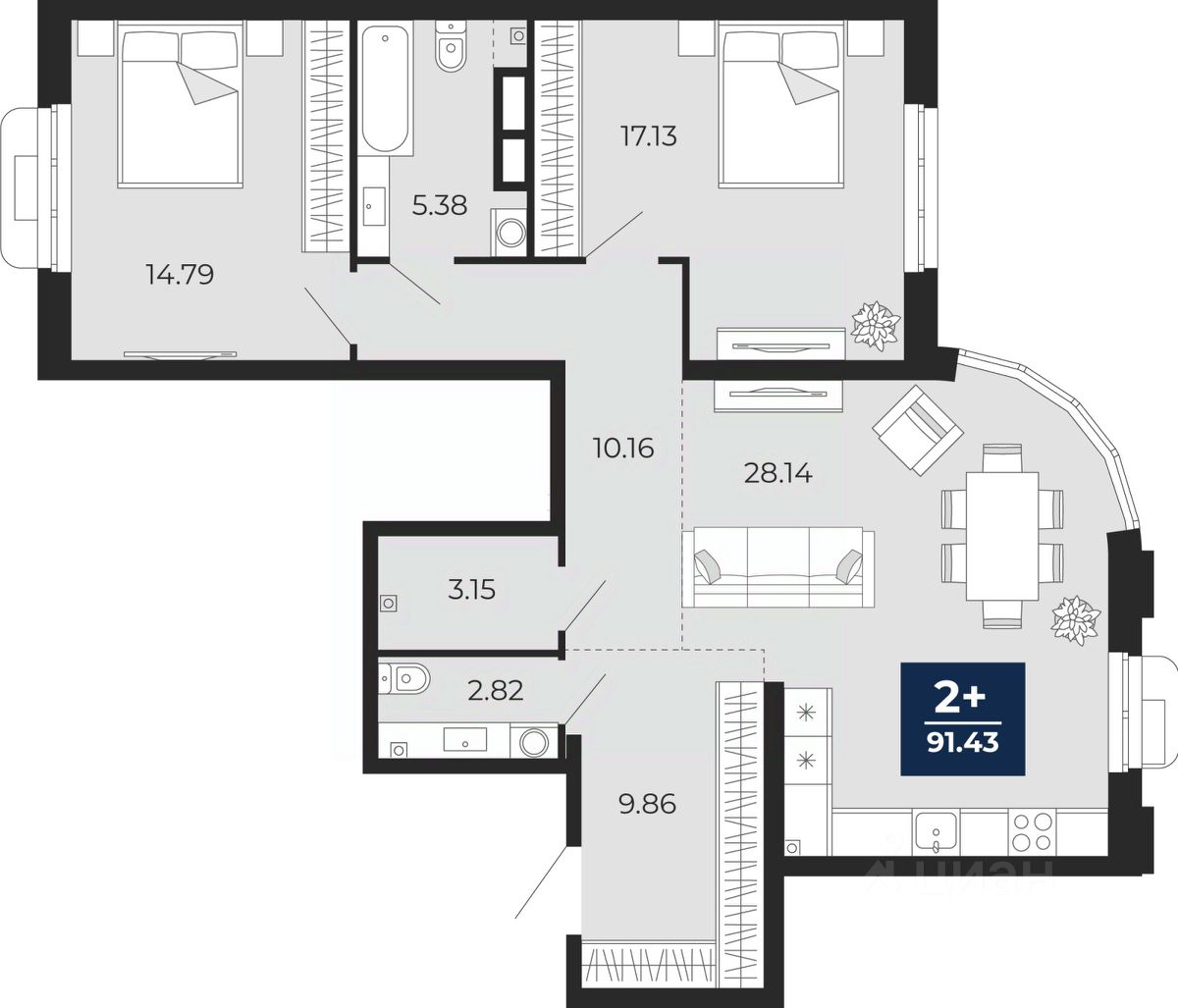 Двухкомнатная квартира с предчистовой отделкой в ЖК "Айвазовский City" на 2 этаже. Общая площадь: 91.43 кв.м. Высота потолков 2.7 м.