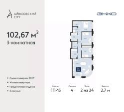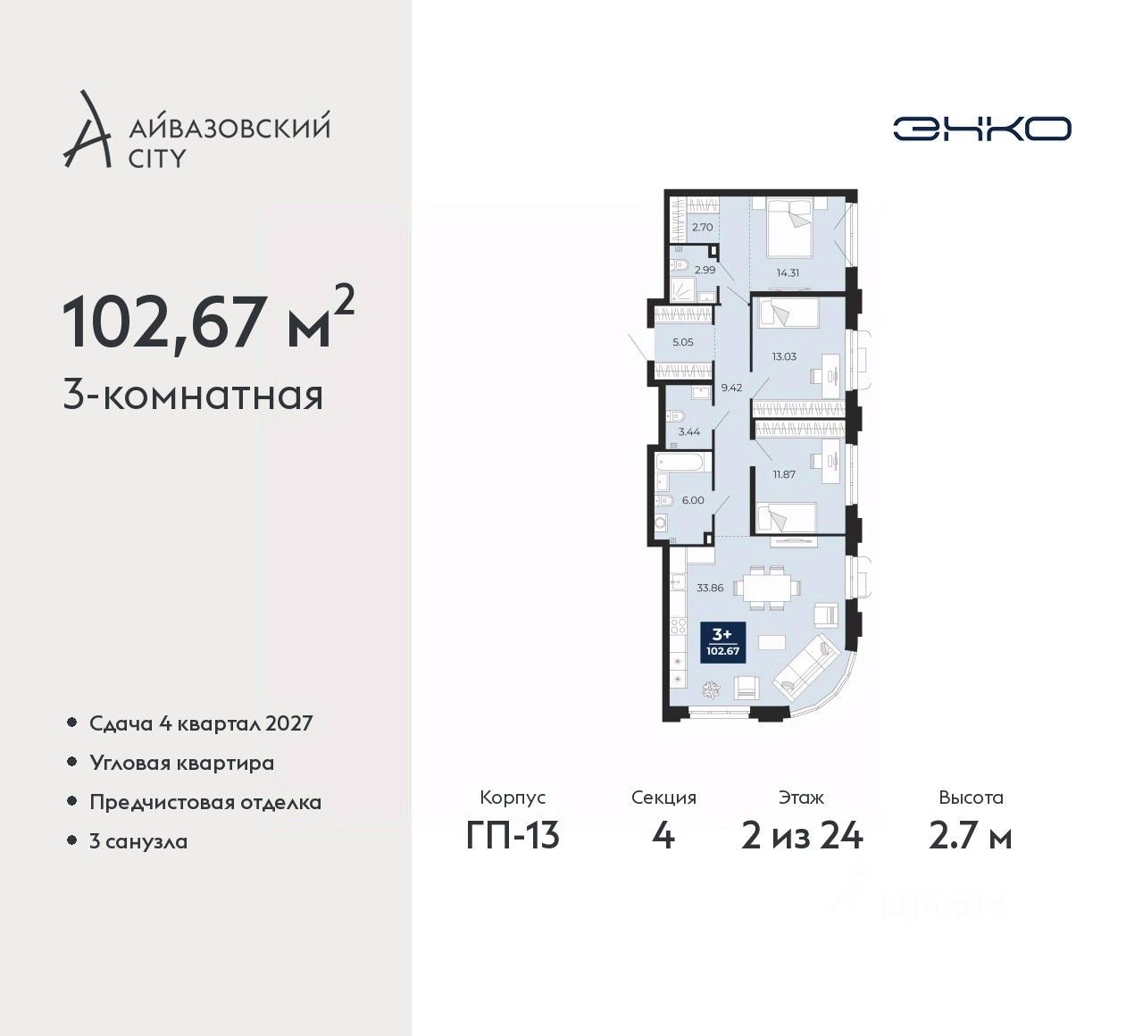 Продается 3-комн. квартира от застройщика с предчистовой отделкой в ЖК "Айвазовский City" на 2 этаже. Общая площадь: 102.67 кв.м., жилая: 39.21 кв.м., площадь просторной кухни-столовой: 33.86 кв.м. Квартира угловая, идеально подойдет любителям тишины и панорамных видов. В квартире два совмещенных и один раздельный санузел. Высота потолков 2.7 м.