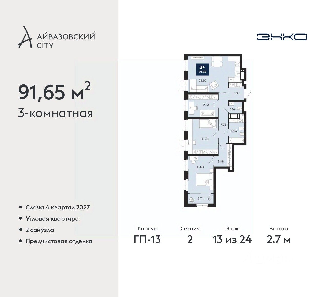 Продается 3-комн. квартира от застройщика с предчистовой отделкой в ЖК "Айвазовский City" на 13 этаже. Общая площадь: 91.65 кв.м., жилая: 38.75 кв.м., площадь просторной кухни-столовой: 25.5 кв.м. Квартира угловая, идеально подойдет любителям тишины и панорамных видов. В квартире один совмещенный и один раздельный санузел. Высота потолков 2.7 м.