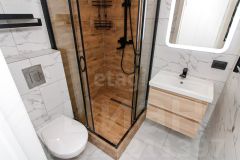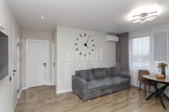 В квартире современный ремонт сделанный для себя. На полу в прихожей и в рабочей кухонной зоне керамогранит с полами с подогревом, по всей остальной квартире прочный ламинат 33-го класса, стеены с декорированным камнем и обоями под покраску, потолки натяжные со светоточками и современными люстрами.