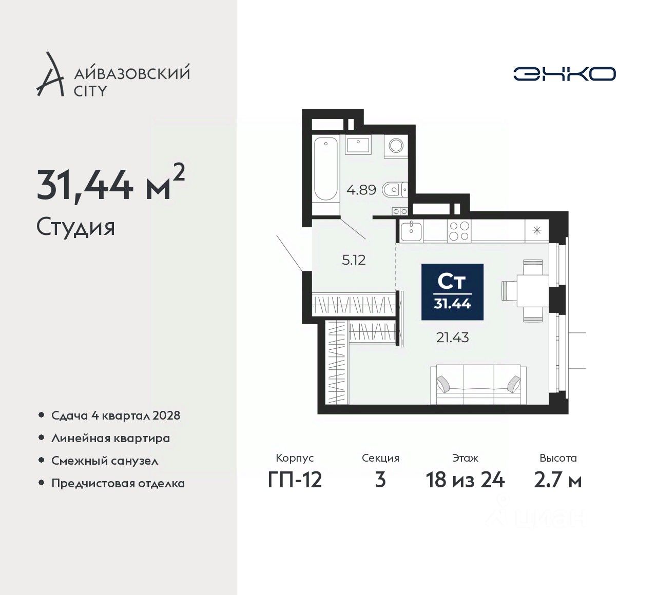 Продается 1-комн. квартира-студия с предчистовой отделкой в ЖК "Айвазовский City" на 18 этаже. Общая площадь: 31.44 кв.м., площадь гостиной 21.43 кв.м., из которых 5 кв.м. выделено под кухонную зону. Все окна выходят на одну сторону. В квартире один совмещенный санузел. Высота потолков 2.7 м.