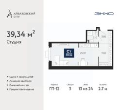 1-комн. квартира-студия с предчистовой отделкой в ЖК "Айвазовский City" на 13 этаже. Общая площадь: 39.34 кв.м., площадь гостиной 26.37 кв.м., из которых 6 кв.м. выделено под кухонную зону. Все окна выходят на одну сторону. В квартире один совмещенный санузел. Высота потолков 2.7 м.
