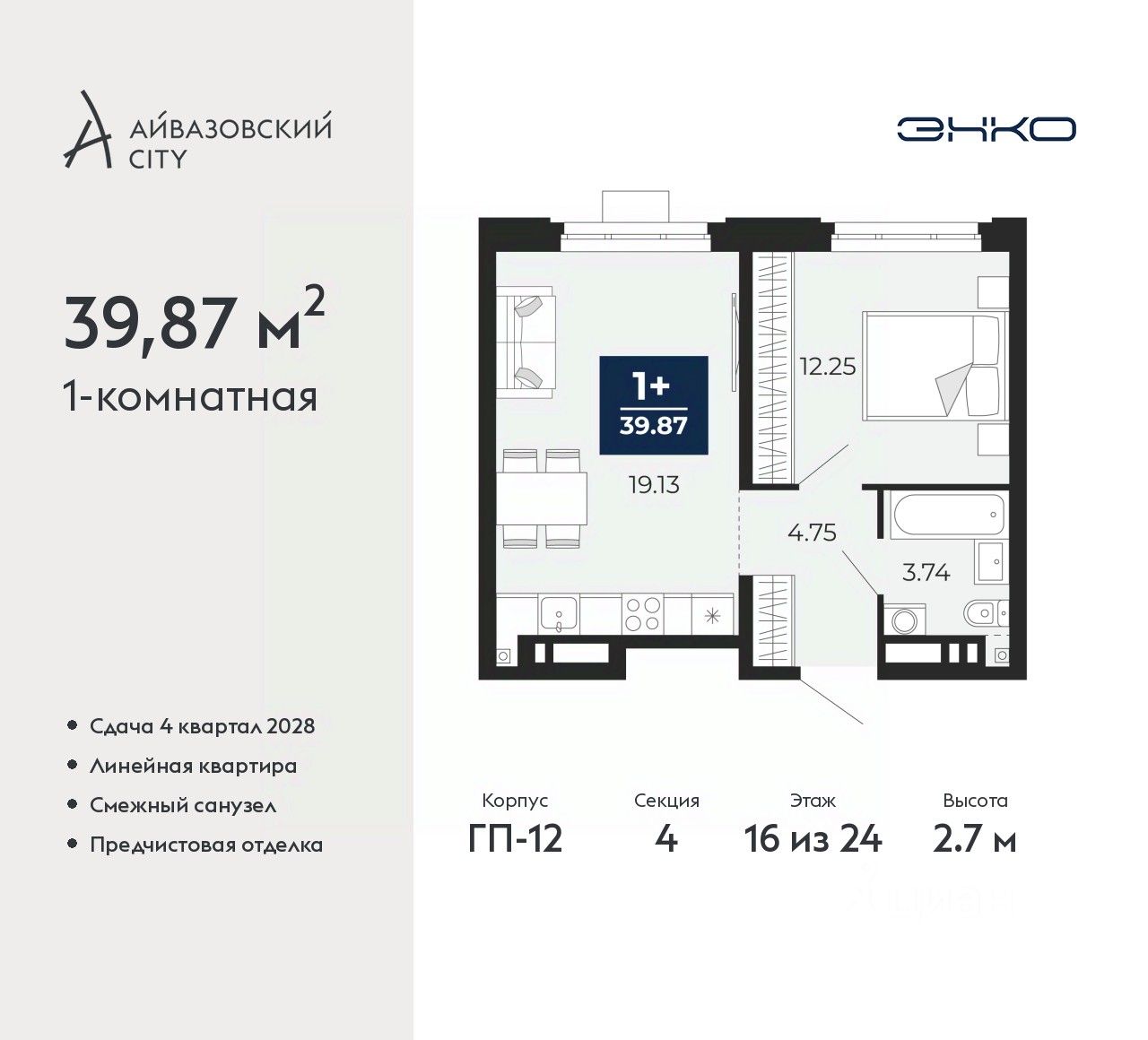 Продается 1-комн. квартира с предчистовой отделкой в ЖК "Айвазовский City" на 16 этаже. Общая площадь: 39.87 кв.м., жилая: 12.25 кв.м., площадь просторной кухни-столовой: 19.13 кв.м. Все окна выходят на одну сторону. В квартире один совмещенный санузел. Высота потолков 2.7 м.