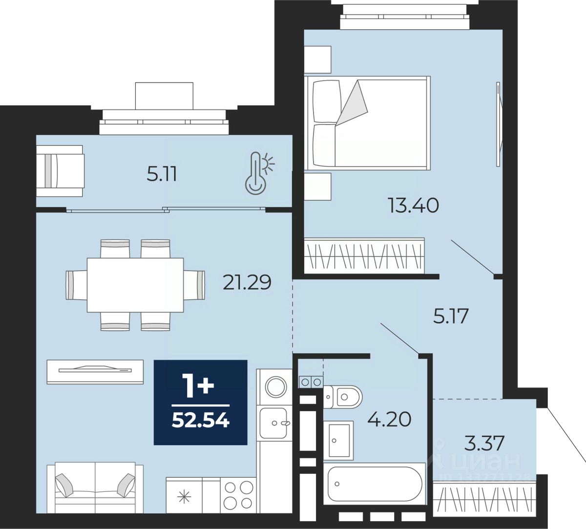 Продается 1-комн. квартира от застройщика с предчистовой отделкой в ЖК "Айвазовский City" на 9 этаже. Общая площадь: 52.54 кв.м., жилая: 13.4 кв.м., площадь просторной кухни-столовой: 21.29 кв.м. Все окна выходят на одну сторону. В квартире одна лоджия, один совмещенный санузел. Высота потолков 2.7 м.