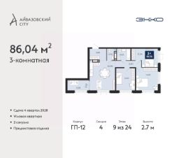 Трехкомнатная квартира с предчистовой отделкой в ЖК "Айвазовский City" на 9 этаже. Общая площадь: 86.04 кв.м., жилая: 39.66 кв.м., площадь просторной кухни-столовой: 22.06 кв.м. Угловая квартира, идеально подойдет любителям тишины и панорамных видов. В квартире один совмещенный и один раздельный санузел. Высота потолков 2.7 м.