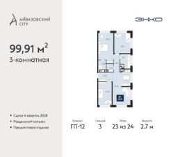 Продается 3-комн. квартира с предчистовой отделкой в ЖК "Айвазовский City" на 23 этаже. Общая площадь: 99.91 кв.м. Высота потолков 2.7 м.