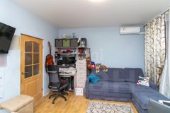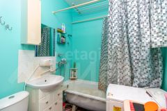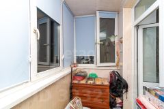 Планировка функциональна: в отделке использованы практичные материалы — натяжной потолок, линолеум, кафель в совмещенном санузле; в прихожей установлен шкаф-купе, просторная лоджия предоставляет дополнительное пространство для хранения.