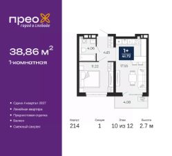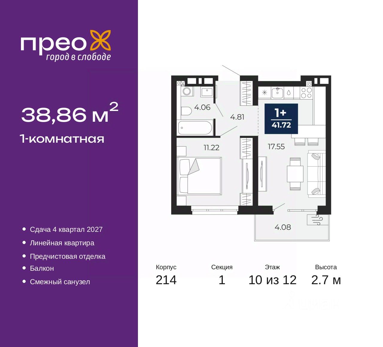 Продается 1-комн. квартира с предчистовой отделкой в ЖК "Прео" на 10 этаже. Общая площадь: 38.86 кв.м., жилая: 11.22 кв.м., площадь просторной кухни-столовой: 17.55 кв.м. Все окна выходят на одну сторону. В квартире один балкон, один совмещенный санузел. Высота потолков 2.7 м.