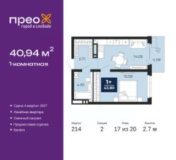1-комн. квартира от застройщика с предчистовой отделкой в ЖК "Прео" на 17 этаже. Общая площадь: 40.94 кв.м., жилая: 15.08 кв.м., площадь просторной кухни-столовой: 14.08 кв.м. Все окна выходят на одну сторону. В квартире один балкон, один совмещенный санузел. Высота потолков 2.7 м.