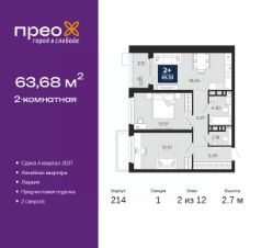 Двухкомнатная квартира с предчистовой отделкой в ЖК "Прео" на 2 этаже. Общая площадь: 63.68 кв.м., жилая: 26.74 кв.м., площадь просторной кухни-столовой: 18.04 кв.м. Комнаты изолированные, все окна выходят на одну сторону. В квартире одна лоджия, один совмещенный и один раздельный санузел. Высота потолков 2.7 м.