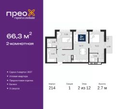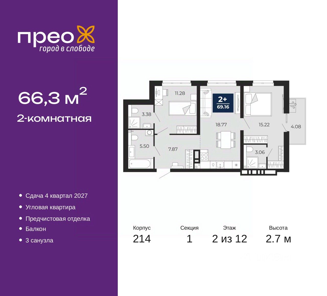 2-комн. квартира с предчистовой отделкой в ЖК "Прео" на 2 этаже. Общая площадь: 66.3 кв.м., жилая: 26.5 кв.м., площадь просторной кухни-столовой: 18.77 кв.м. Квартира угловая, идеально подойдет любителям тишины и панорамных видов. В квартире один балкон, три совмещенных санузла. Высота потолков 2.7 м.