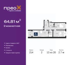 2-комн. квартира от застройщика с предчистовой отделкой в ЖК "Прео" на 13 этаже. Общая площадь: 64.81 кв.м., жилая: 26.23 кв.м., площадь просторной кухни-столовой: 18.45 кв.м. Квартира - распашонка, без проходных комнат, окна выходят на paзные стороны дома. В квартире один балкон, один совмещенный и один раздельный санузел. Высота потолков 2.7 м.