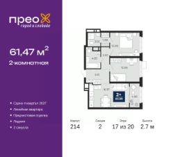 Продается 2-комн. квартира от застройщика с предчистовой отделкой в ЖК "Прео" на 17 этаже. Общая площадь: 61.47 кв.м., жилая: 24.12 кв.м., площадь просторной кухни-столовой: 16.37 кв.м. Комнаты изолированные, все окна выходят на одну сторону. В квартире одна лоджия, два совмещенных санузла. Высота потолков 2.7 м.