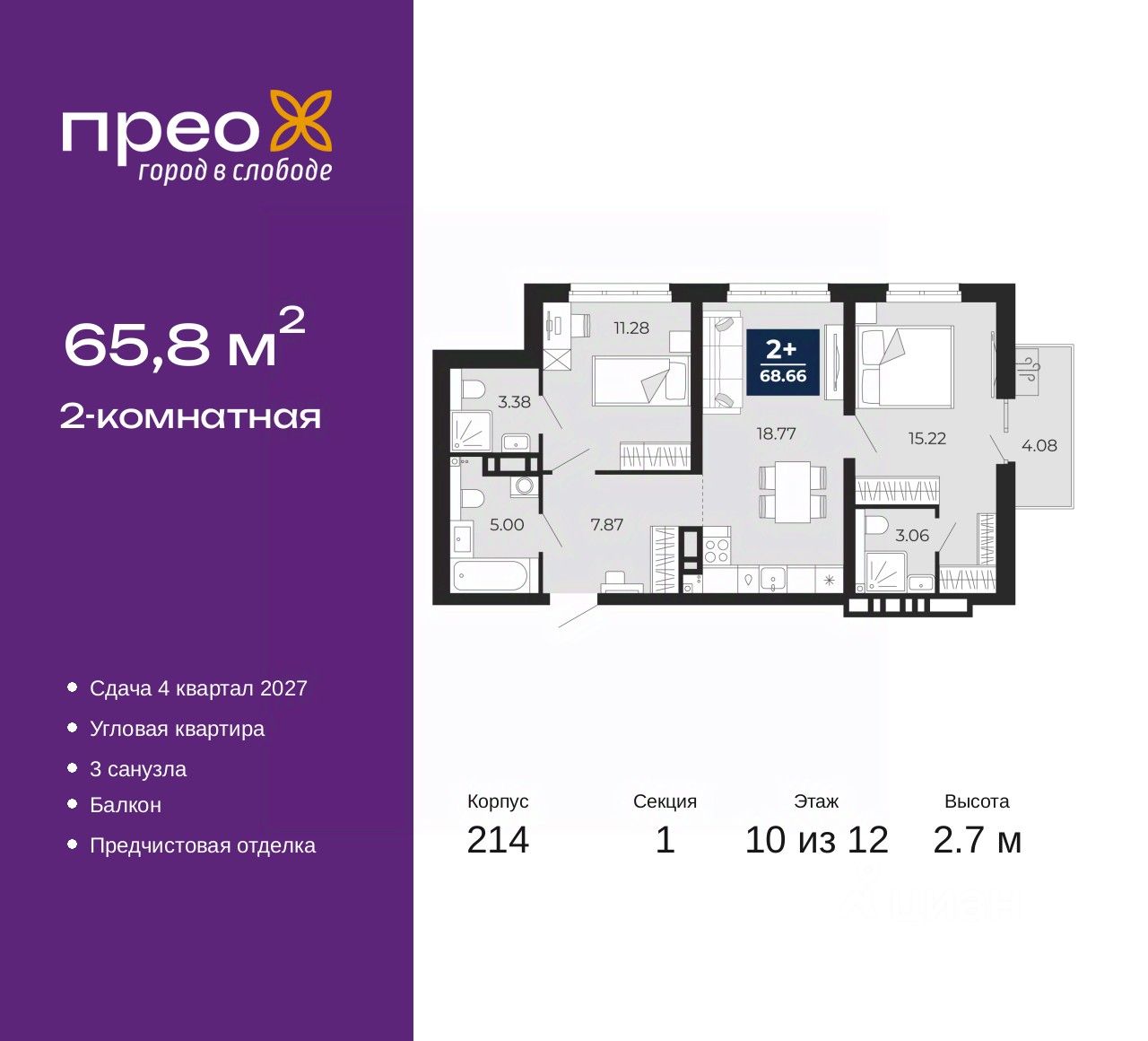Просторная 2-комн. квартира с предчистовой отделкой в ЖК "Прео" на 10 этаже. Общая площадь: 65.8 кв.м., жилая: 26.5 кв.м., площадь просторной кухни-столовой: 18.77 кв.м. Квартира угловая, окна oбecпeчивaют paвнoмepнoe ocвeщeниe в тeчeниe дня. В квартире один балкон, три совмещенных санузла. Высота потолков 2.7 м.