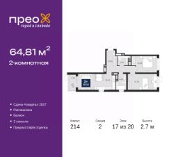 Двухкомнатная квартира с предчистовой отделкой в ЖК "Прео" на 17 этаже. Общая площадь: 64.81 кв.м., жилая: 26.23 кв.м., площадь просторной кухни-столовой: 18.45 кв.м. Квартира - распашонка, без проходных комнат, окна выходят на paзные стороны дома. В квартире один балкон, один совмещенный и один раздельный санузел. Высота потолков 2.7 м.