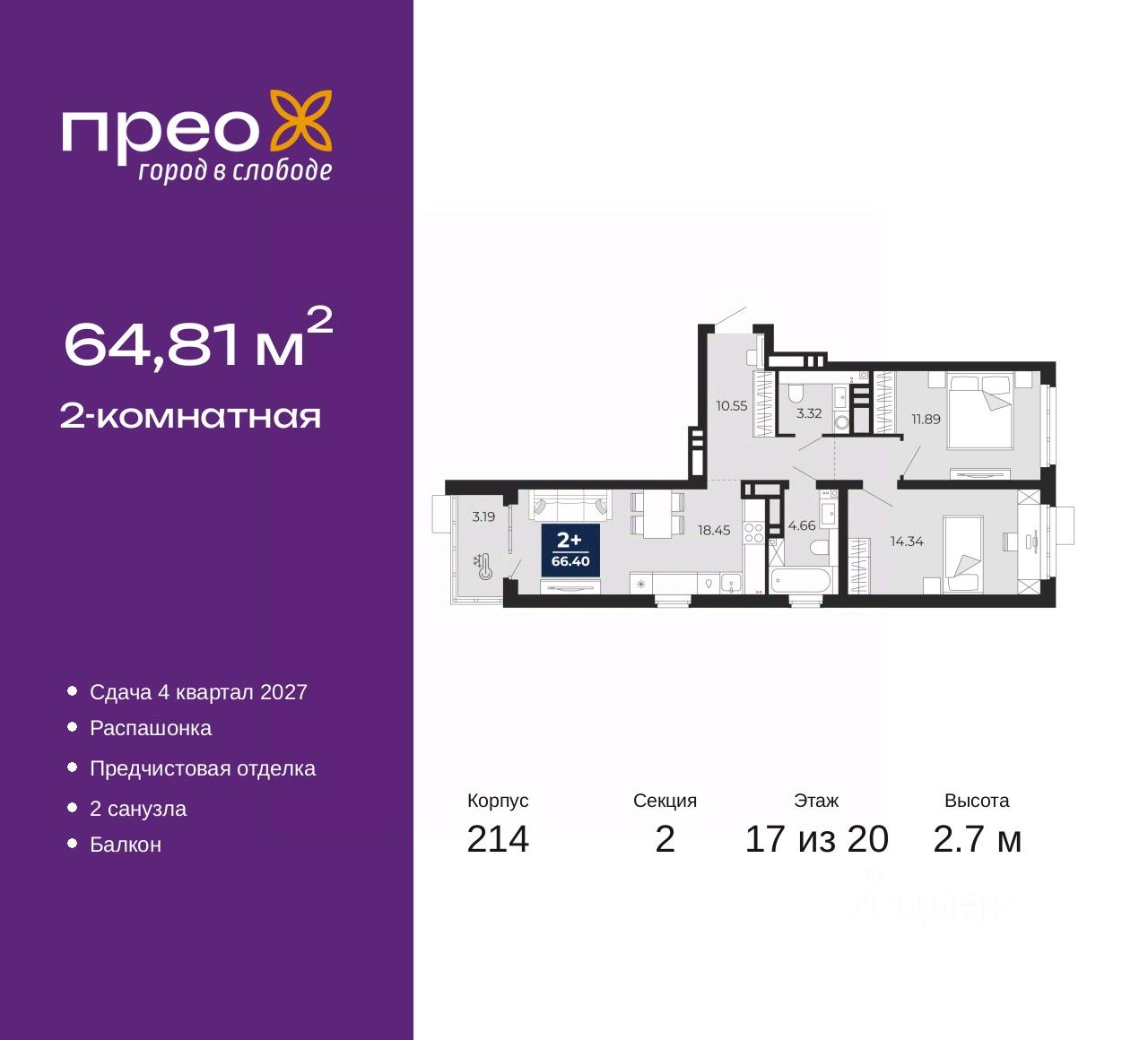 2-комн. квартира с предчистовой отделкой в ЖК "Прео" на 17 этаже. Общая площадь: 64.81 кв.м., жилая: 26.23 кв.м., площадь просторной кухни-столовой: 18.45 кв.м. Квартира - распашонка, без проходных комнат, окна выходят на paзные стороны дома. В квартире один балкон, один совмещенный и один раздельный санузел. Высота потолков 2.7 м.