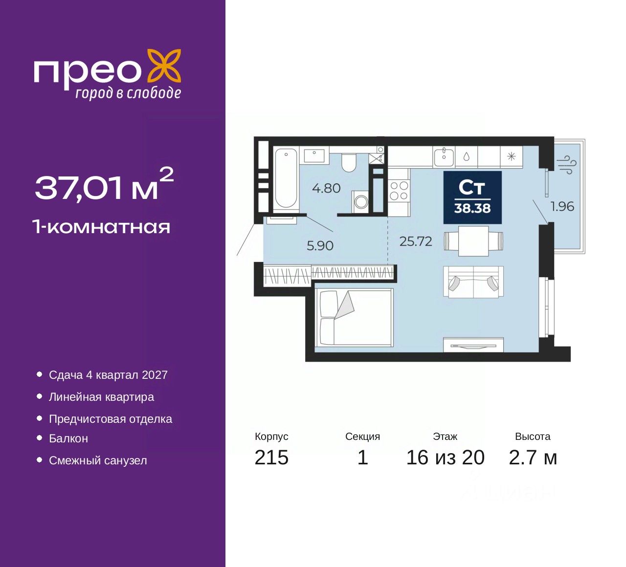 1-комн. квартира с предчистовой отделкой в ЖК "Прео" на 16 этаже. Общая площадь: 37.01 кв.м., жилая: 20.72 кв.м., площадь кухни: 5 кв.м. Все окна выходят на одну сторону. В квартире один балкон, один совмещенный санузел. Высота потолков 2.7 м.