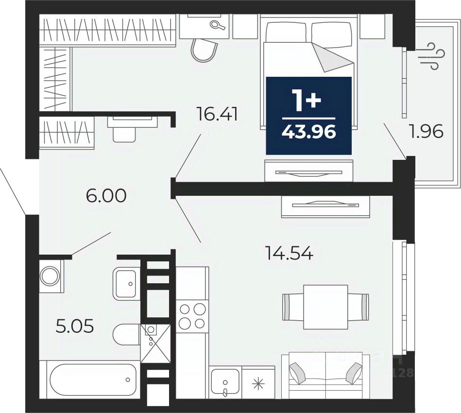 1-комн. квартира с предчистовой отделкой в ЖК "Прео" на 16 этаже. Общая площадь: 42.59 кв.м., жилая: 16.41 кв.м., площадь просторной кухни-столовой: 14.54 кв.м. Все окна выходят на одну сторону. В квартире один балкон, один совмещенный санузел. Высота потолков 2.7 м.