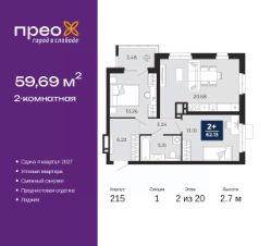 Просторная двухкомнатная квартира с предчистовой отделкой в ЖК "Прео" на 2 этаже. Общая площадь: 59.69 кв.м., жилая: 23.36 кв.м., площадь просторной кухни-столовой: 20.68 кв.м. Квартира угловая, идеально подойдет любителям тишины и панорамных видов. В квартире одна лоджия, один совмещенный санузел. Высота потолков 2.7 м.