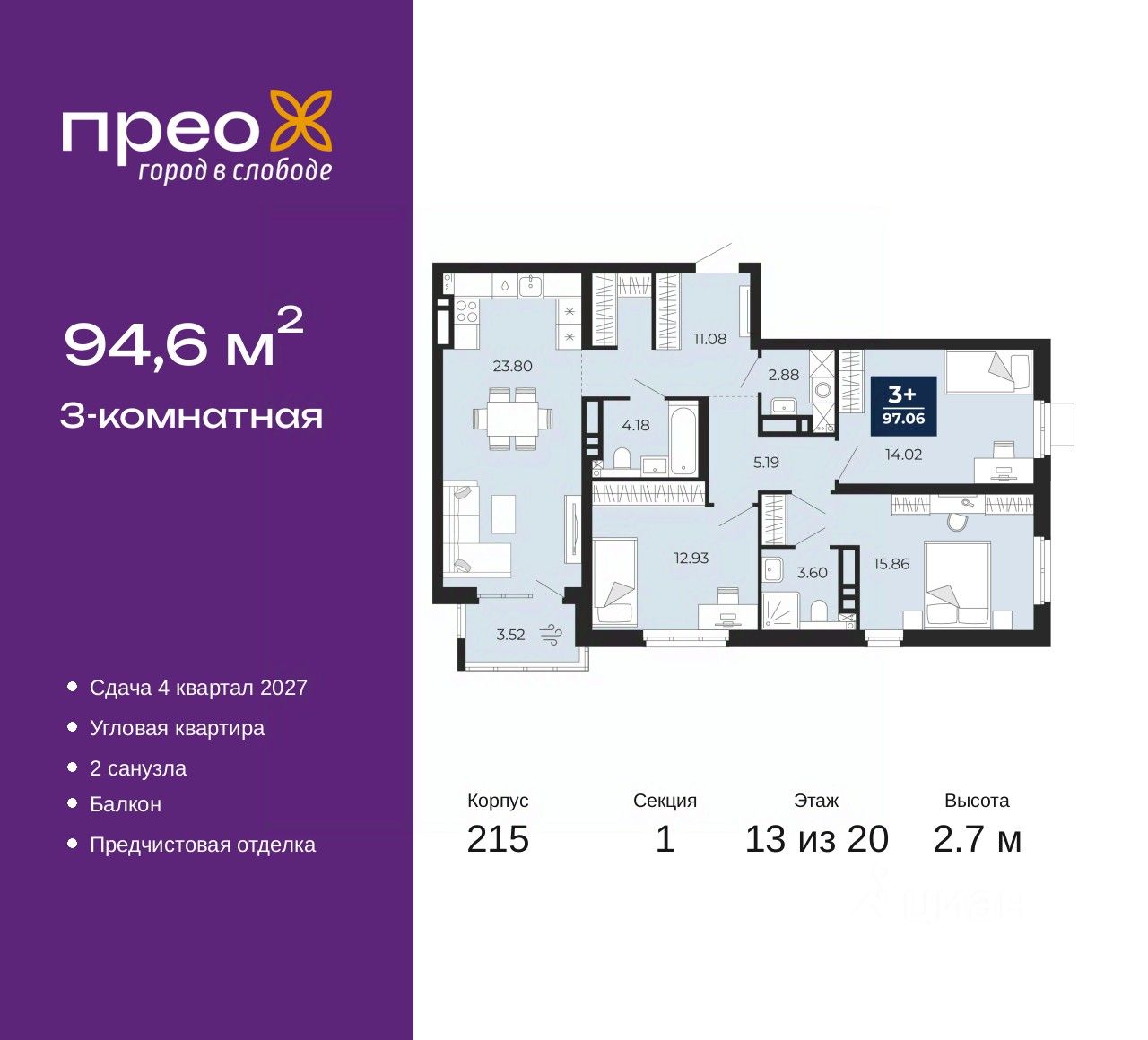 Просторная 3-комн. квартира с предчистовой отделкой в ЖК "Прео" на 13 этаже. Общая площадь: 94.6 кв.м., жилая: 42.81 кв.м., площадь просторной кухни-столовой: 23.8 кв.м. Квартира угловая, идеально подойдет любителям тишины и панорамных видов. В квартире один балкон, два совмещенных санузла. Высота потолков 2.7 м.