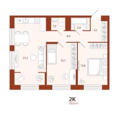 2-комн. квартира, 59,8 м²
