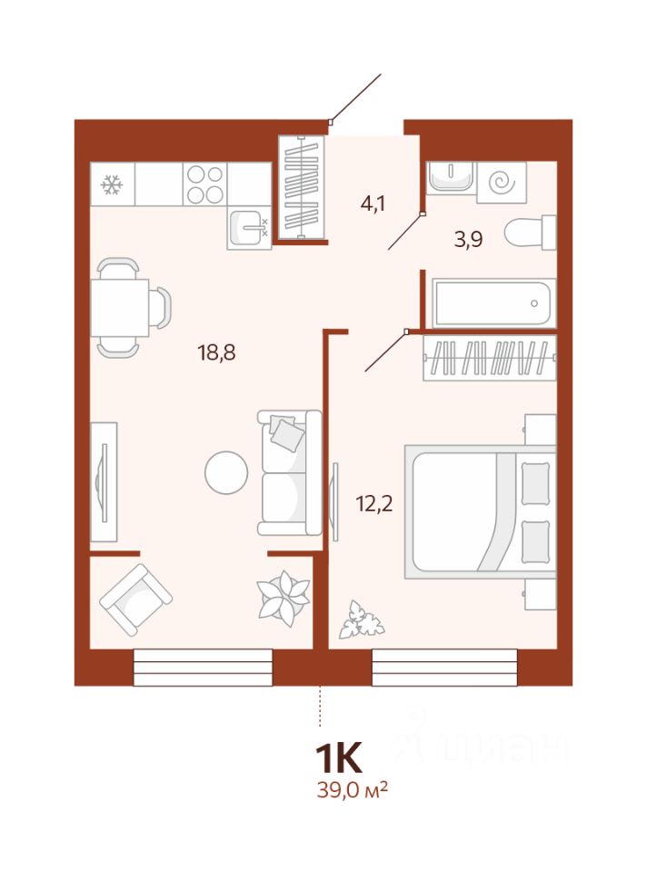 1-комн. квартира, 39 м²