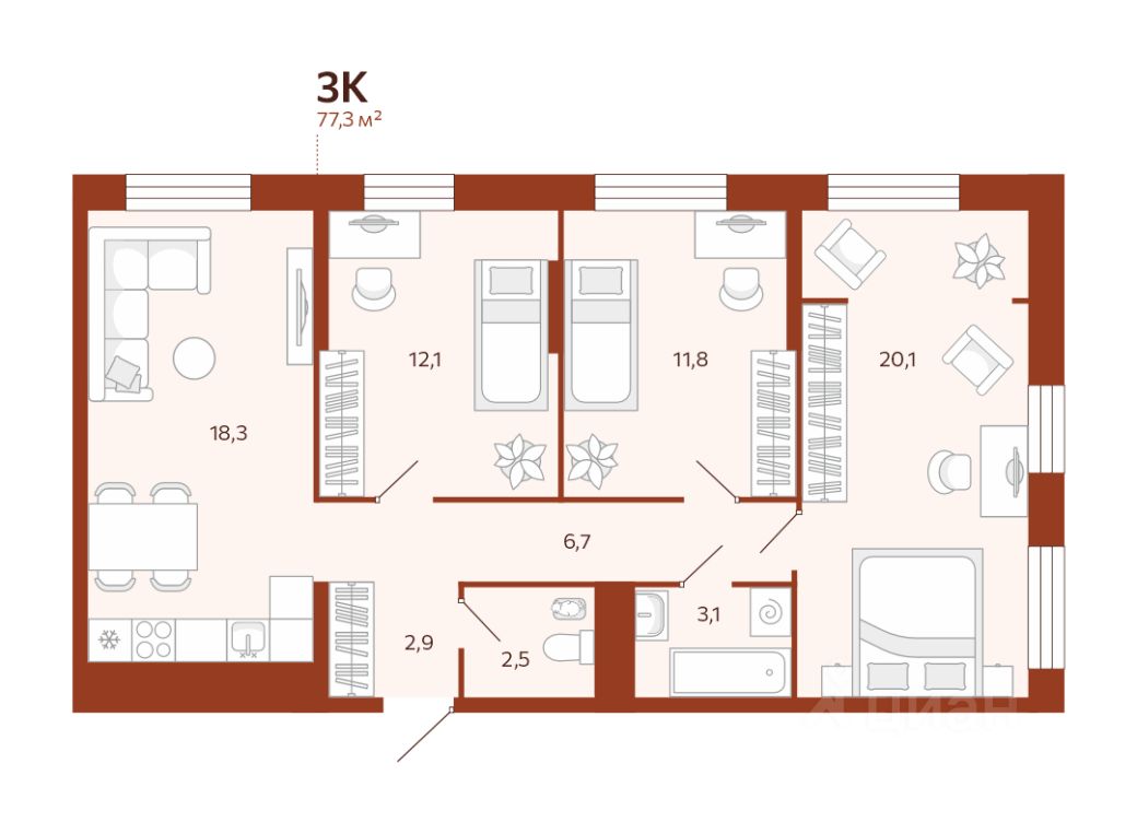 3-комн. квартира, 77,3 м²
