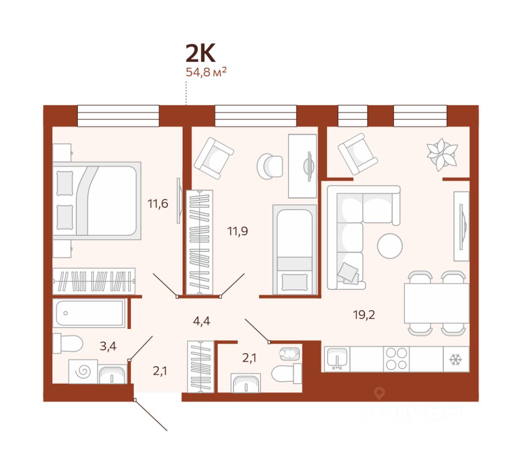 2-комн. квартира, 54,8 м²