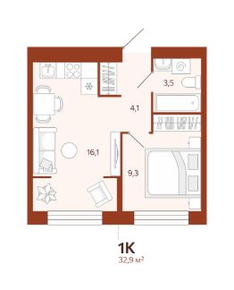 1-комн. квартира, 32,9 м²